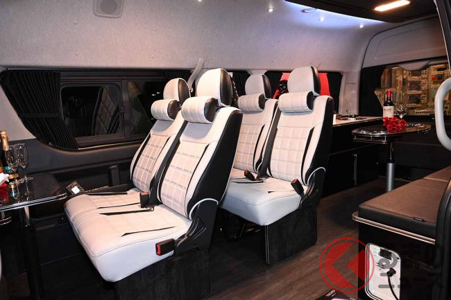 スライドドアを開けると、足元はフワフワしたカーペットが広がります。シートには白いレザーを使用。さらに車内の各所にボトルやグラスを置けるスペースも設けられ、高級クラブのような空間です。