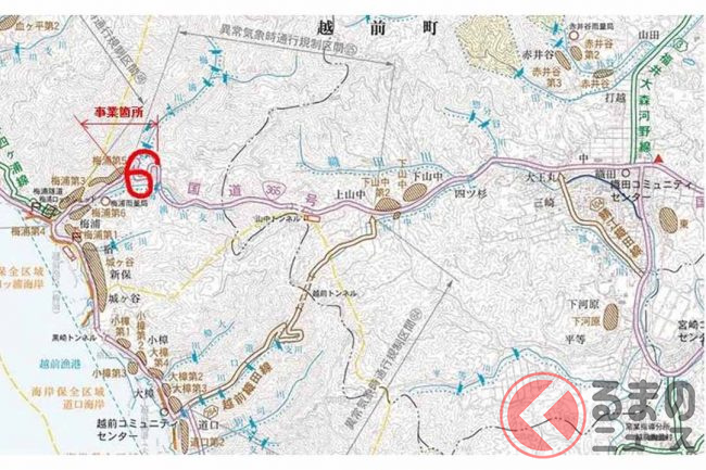 このうち越前町から越前市に至る区間は、2023年11月に開通したばかりの国道417号冠山峠道路や、2024年3月に開業を控える北陸新幹線の越前たけふ駅から越前海岸までを東西に結ぶメインルートになりますが、途中の越前町梅浦には、クネクネとひもがもつれたような急カーブの続く箇所があります。