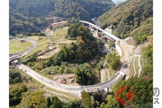梅浦バイパス(2期区間)の計画延長は1220m、計画幅員は9.0mです。橋やトンネル(長さ215m)などでゆったりとしたカーブを描きながら、高低差を克服します。