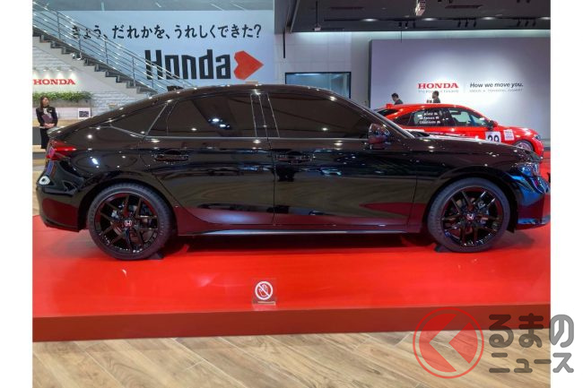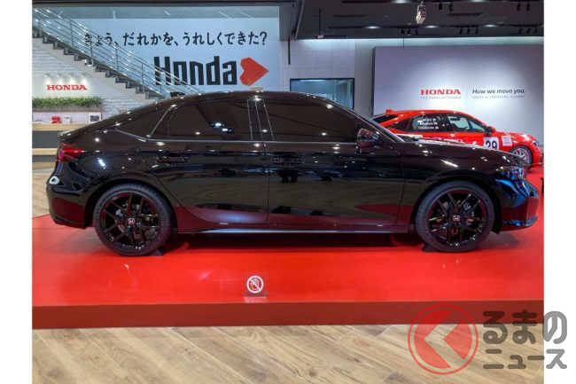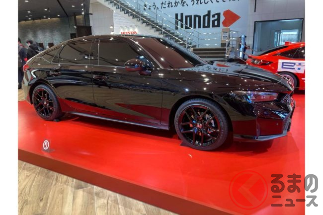 ホンダ新型「スポーティハッチバック」実車展示! 高性能タイプの「RS」! ブラックボディがカッコイイ「シビック」に注目集まる