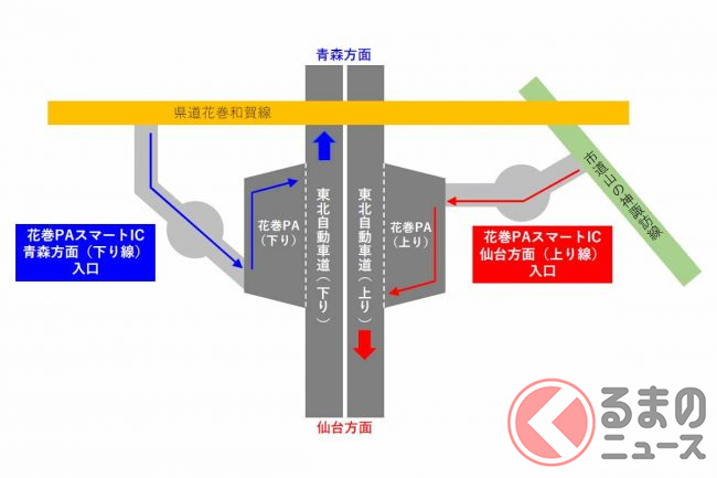 花巻PAスマートICは、東北道の北上江釣子IC(岩手県北上市)から北へ7.9km、花巻南IC(花巻市)から南へ1.9kmの位置にある花巻PA(同)に設置されます。