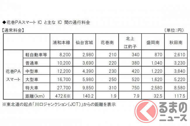 花巻PAスマートICへの通行料金(ETC通常料金、普通車)は、東北道の浦和本線から1万200円、仙台宮城ICから3690円、盛岡南ICから1040円、秋田道の秋田南ICから3230円です。