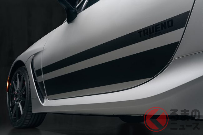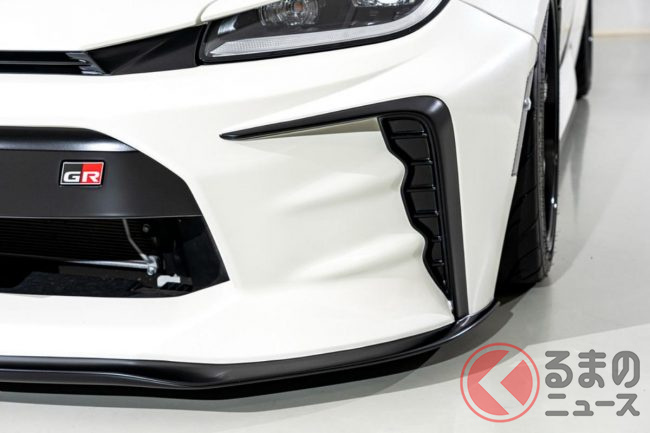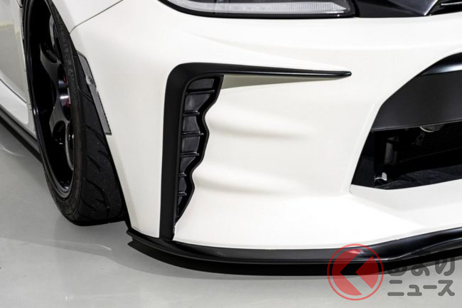 アイラインも付いたフロントフェイスは、通常モデルより鋭さが増した印象を放ちます。最新のトヨタ車に採用されている「ハンマーヘッド」デザインを彷彿とし、“次期型GR86”や「プリウス」のクーペ版のようにも感じられます。