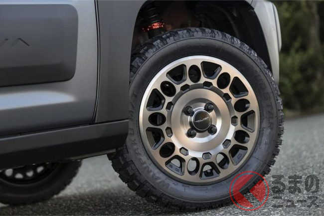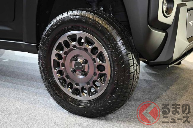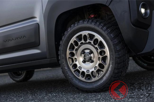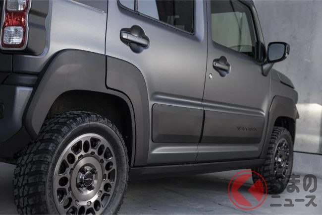 サイドは、軽自動車規格を超えない範囲で前後フェンダーによるワイド化(片側9mm以内)を図るとともに、ドアパネルの下部にプロテクター、サイドシル(ロッカー)に厚みのあるステップを装着し、装甲車のようなタフな雰囲気を持たせています。