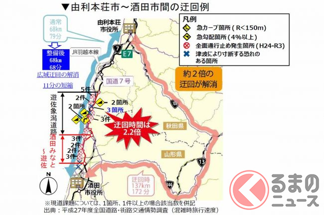 なお、遊佐鳥海ICから象潟IC(秋田県にかほ市)までの県境越え区間17.9kmは、国道7号バイパス「遊佐象潟道路」として建設が進んでいます。