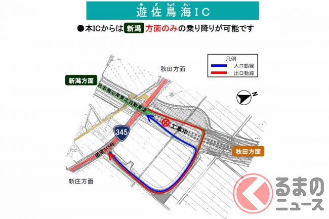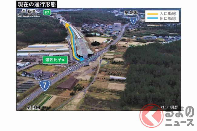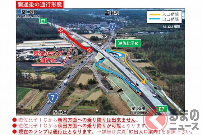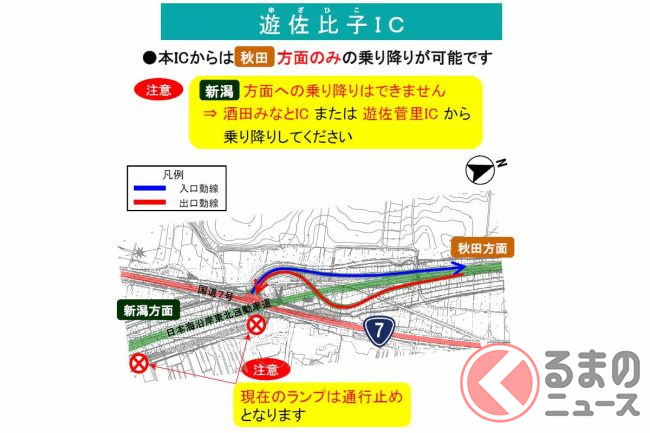 開通後、遊佐比子ICは従来の新潟方面の出入口が閉鎖され、秋田方面の出入口だけに変わります。