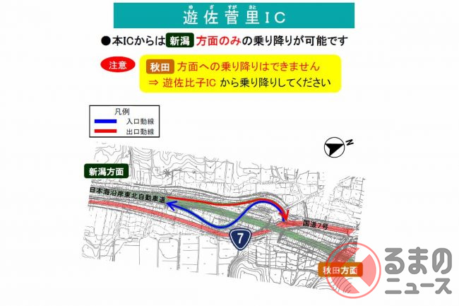 途中に設置される遊佐菅里ICは国道7号に接続し、新潟方面のみの出入りが可能です。