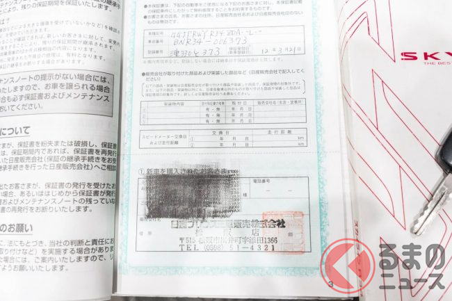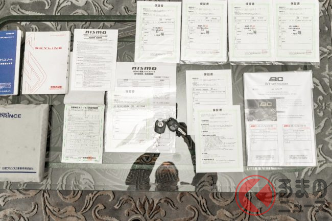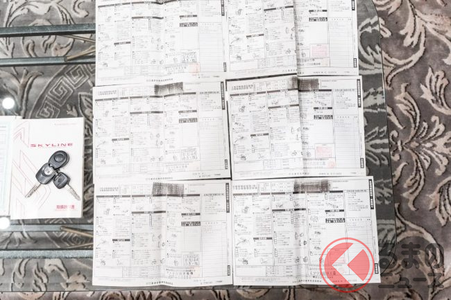 なお、出品写真には日本国内での整備記録簿や取扱説明書、中古車業者向けオークションの出品票が残されており、国内ワンオーナー車であったことや、三重県内の日産プリンス店で新車購入されていたことがわかります。