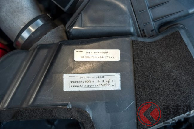 そのほか、タイミングベルト交換を示すステッカーや指定空気圧のプレートなど、日本語表記も多く残っており、現地マニアにはたまらない逸品といえます。