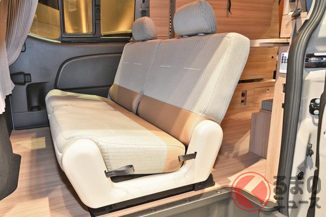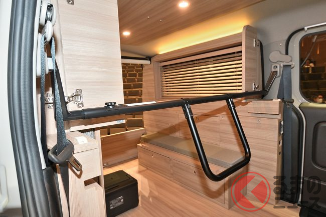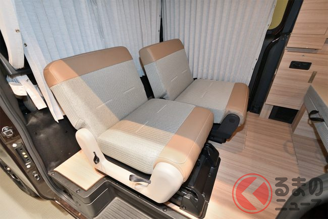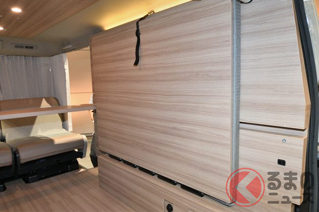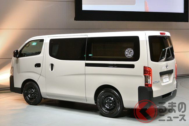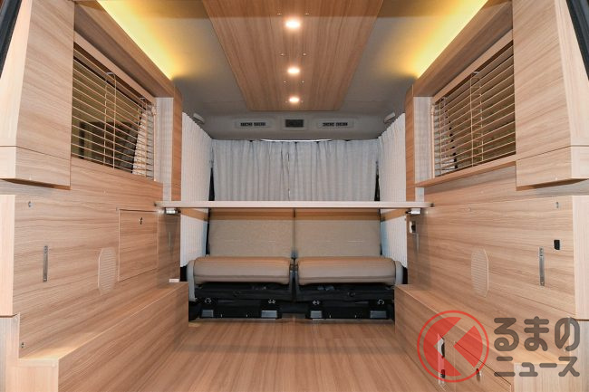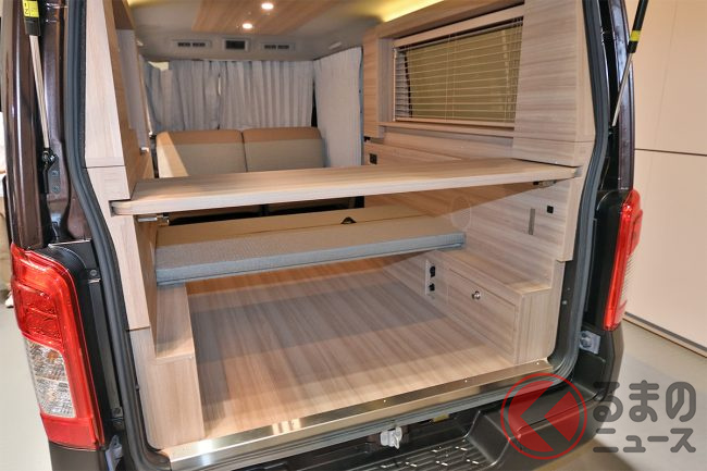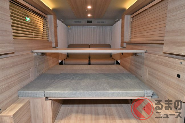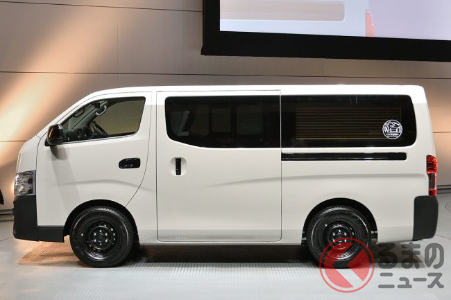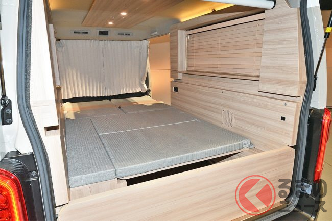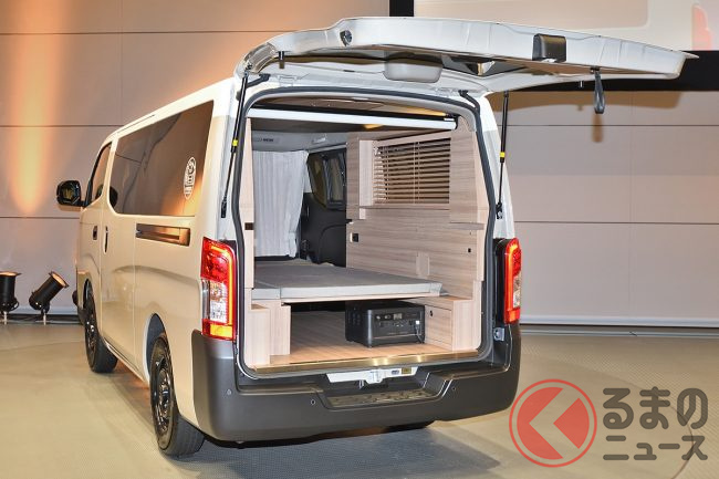 ニッサン新型「“斬新・豪華”車中泊カー」実車公開! 木目がオシャな「巨大ベッドルーム」完備! もはや「お部屋」!? 新「黒顔キャラバン」登場