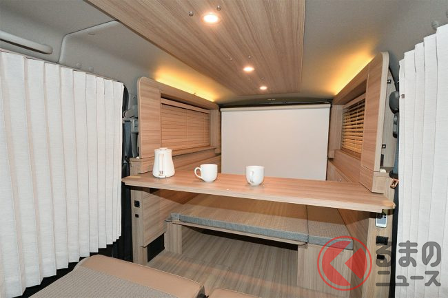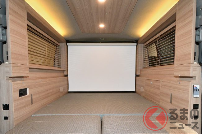 車体最後部には1170mm幅のロールスクリーンを用意。ちょっとした目隠しだけでなく、プロジェクターを投影して映画などを楽しむこともできます。