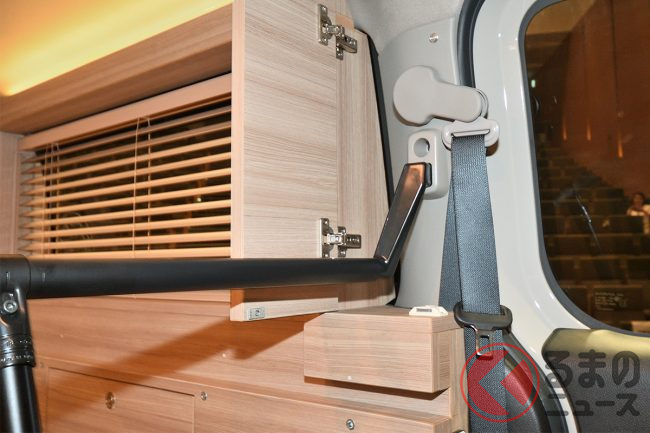 クォーターウィンドウ部分には、家屋に使用するのと同じ「本物の」ブラインドが設けられ、その開閉レバーや紐の先端が走行中に音を立てないよう、マグネットで固定するなどの細かな配慮も欠かしていません。