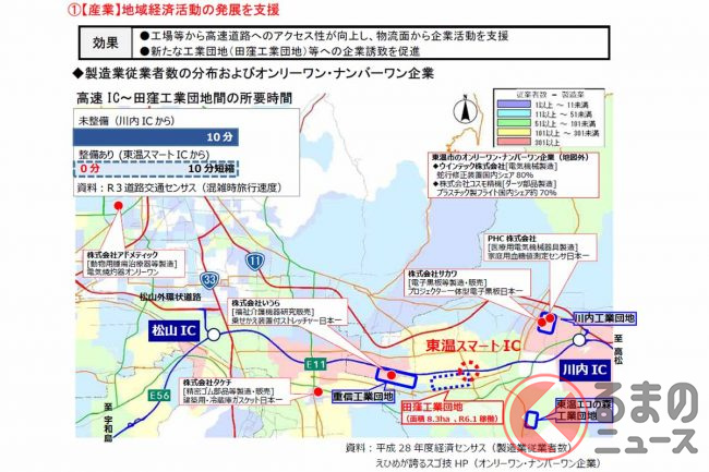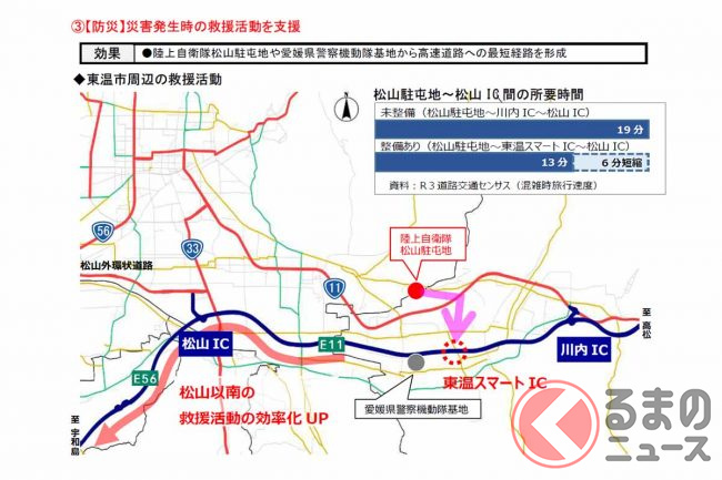 市とNEXCO西日本によると、スマートICの整備により工業団地へのアクセス性向上、救急病院への搬送時間短縮、陸自松山駐屯地や県警察機動隊基地から高速道路への最短経路形成による災害時の救援活動支援、スマートIC周辺の観光振興などが期待されています。