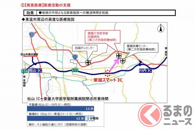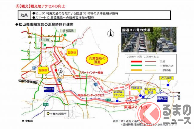 また、隣りの松山ICを利用するクルマが分散することで、同ICに接続する国道33号などの渋滞緩和も期待できるとしています。