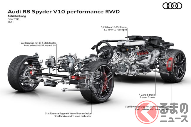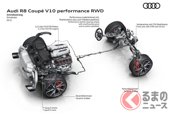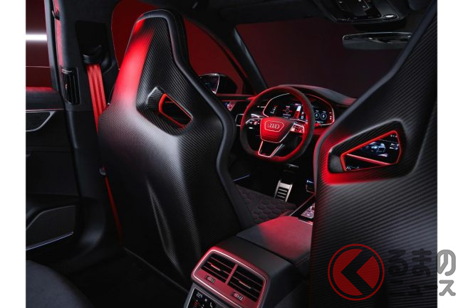 最高出力は30ps増の630ps、最大トルクは50Nm増の850Nm。そのスペックは2023年に新設定された「RS6アバント パフォーマンス」と基本的に同じですが、ボンネットやフェンダーをカーボンにするなど軽量化を図ったほか、またサスペンションも専用設計になっており、0-100km/h加速はパフォーマンスより0.1秒速い3.3秒。最高速度は305km/hに達します。