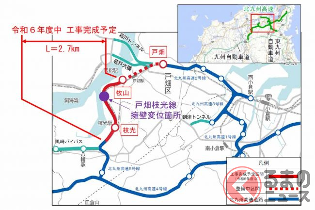 北九州市と福岡北九州高速道路公社は2024年1月31日、建設を進めている「戸畑枝光線」のうち牧山から枝光までの2.7km(1期区間)について、遅れていた工事が2024年度中に完成する見通しとなったと発表しました。