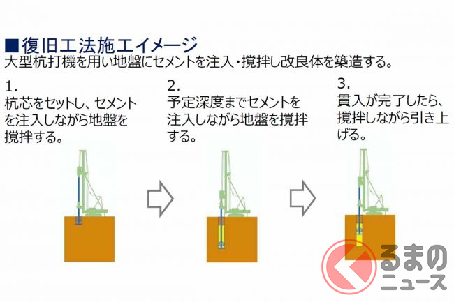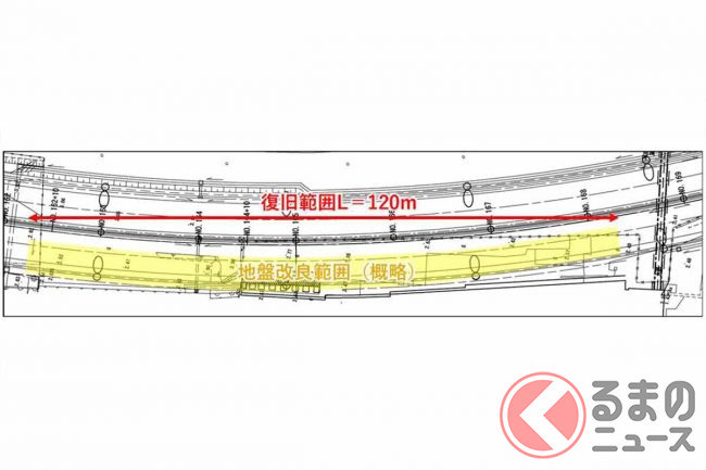 復旧は、この約120m区間を対象に、擁壁の下にセメントを注入・攪拌(かくはん)する地盤改良工事を行うといいます。その後、舗装や通信回線工事なども実施する計画です。