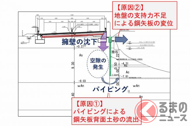 ところが2023年5月と7月、大雨により1期区間のうち延長約120mで土砂流出などが生じ、施工済みの道路擁壁が沈下。その後、有識者を交えた会議で原因の検証や復旧計画が検討されてきました。