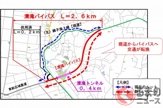 千葉県道73号銚子海上線の清滝バイパスが、2024年3月に開通します。これにより、成田方面から神栖・銚子方面に抜ける一本道の「バイパスルート」ができます。