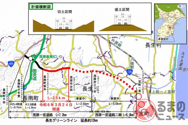 今回開通するのは、現在の終点の長南町坂本から茂原市台田(県道27号茂原大多喜線)までの2.5kmです。