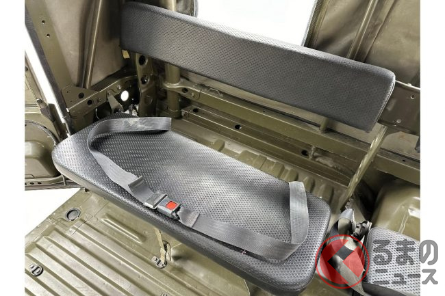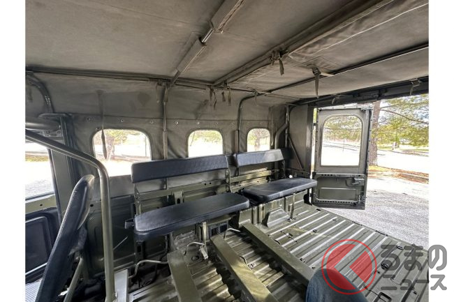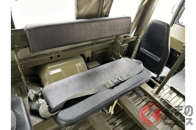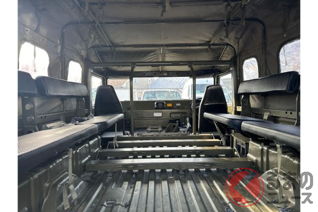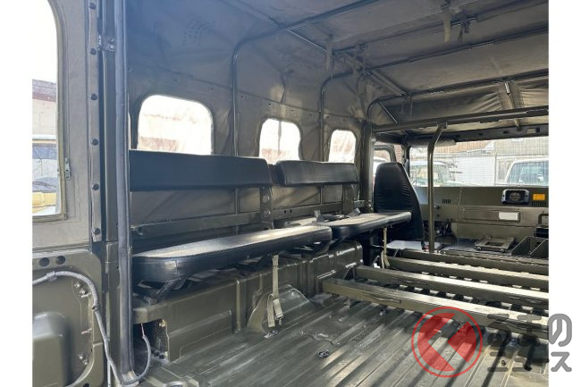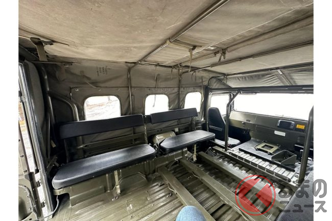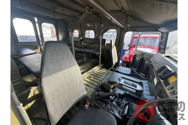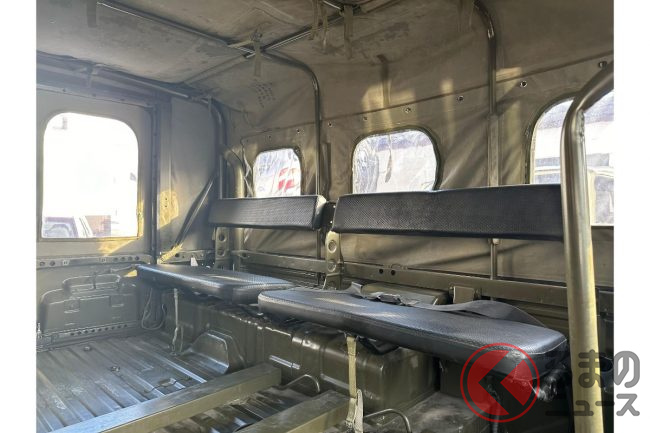 さらに、フロントフェイスもメガクルーザーの角型ライトではなく整備性の高い丸形ヘッドライトが装着され、エアコンは非装着。シートもパイプとクッションのみの簡素なもので、リアシートは乗員を増やした縦型シートが装備されるなど、明らかに民生車両とは異なります。