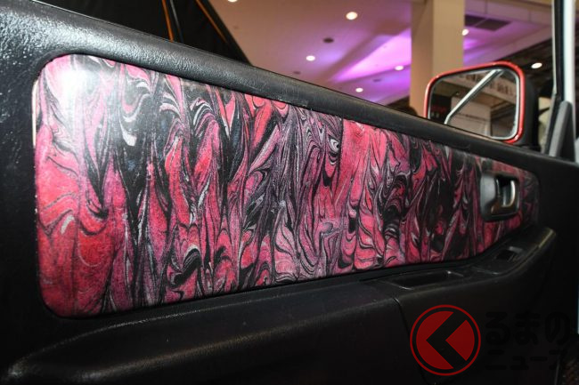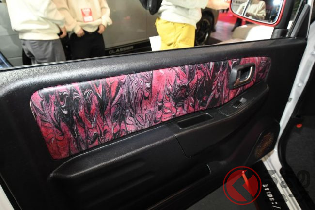 それは車内も例外ではなく、ドアパネルには神社仏閣をイメージさせる赤と紫の革張りを採用。さらにドアスピーカーの部分には障子の格子に見立てた形状としています。