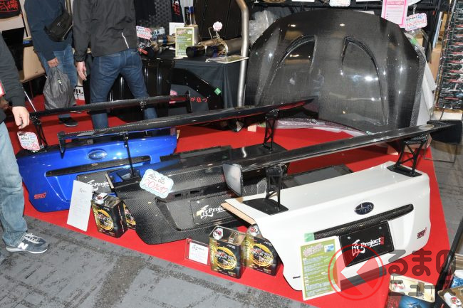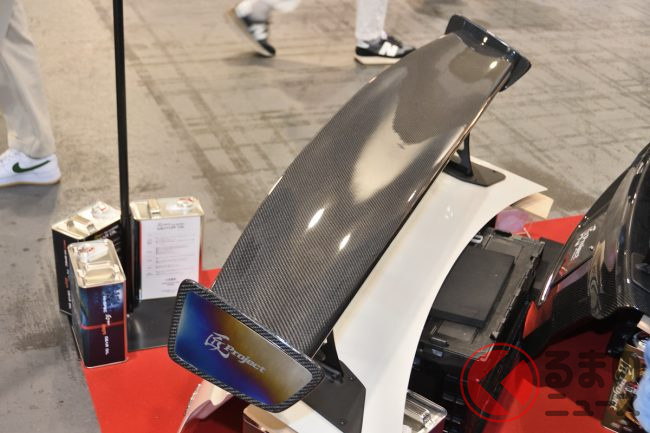 また今後力を入れていくパーツは「GTウイング」だと担当者は話します。翼長1400mm、翼幅1600mm、センターマウント、純正ウイングの取り付け穴を使用して取り付けるタイプなどをラインナップする予定で、翼自体の形状や翼端板(よくたんばん)の形状についても複数の種類から選択できるのが同社製品のメリット。