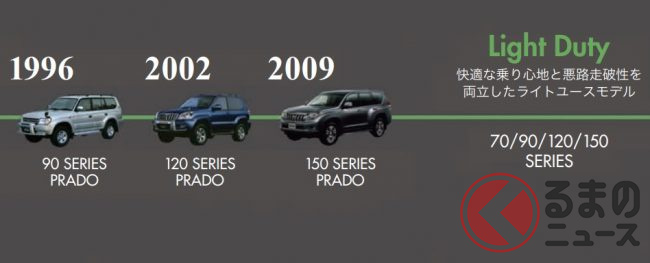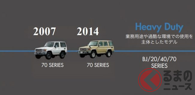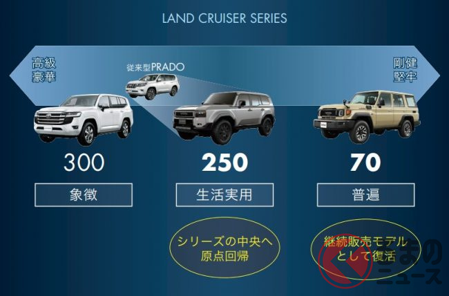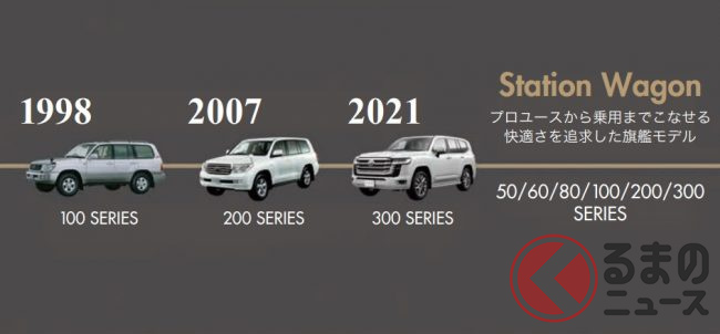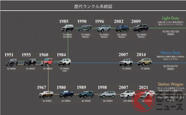 その後、ランドクルーザーは3系統に分かれ、現在はライトデューティーの「250」、悪路走行などに特化した「70」、最上位モデルのステーションワゴン「300」となっています。