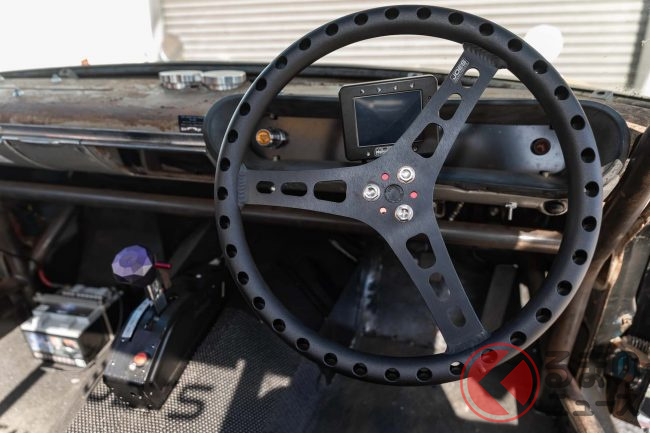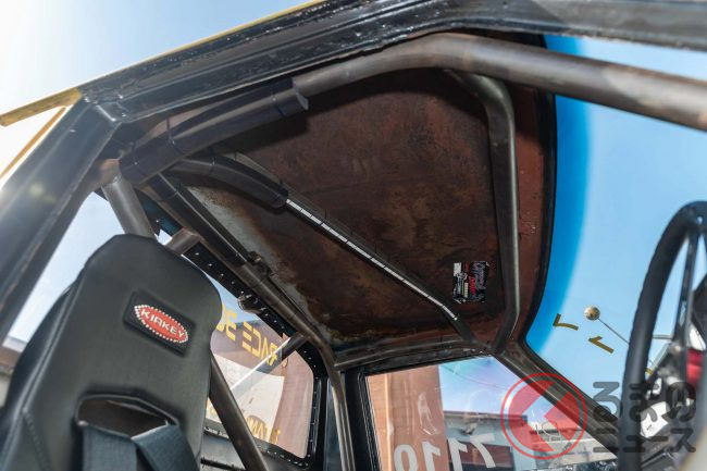 車内は内張りなどが剥がされた状態で、ボディ剛性を上げるためのロールケージを装備し、レース仕様であることを示しています。