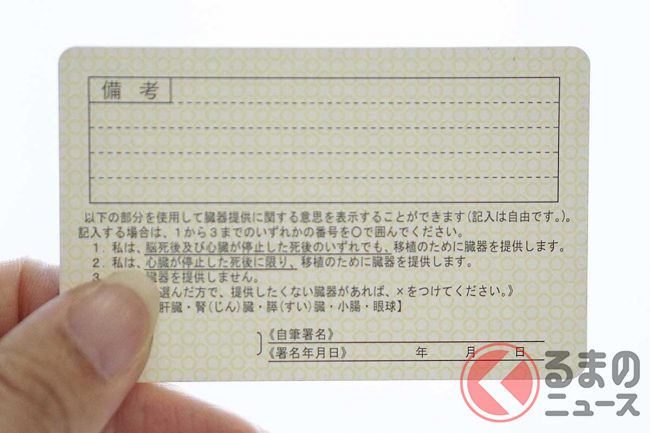 このうち臓器提供意思表示欄は、事故や突然の病気などで万が一の事態になったときに、ドナーとして臓器を提供するか否かを示すもの。どのようにしたいかという1から3の選択肢に〇をつけておくことで、自らの意向を明示することができます。