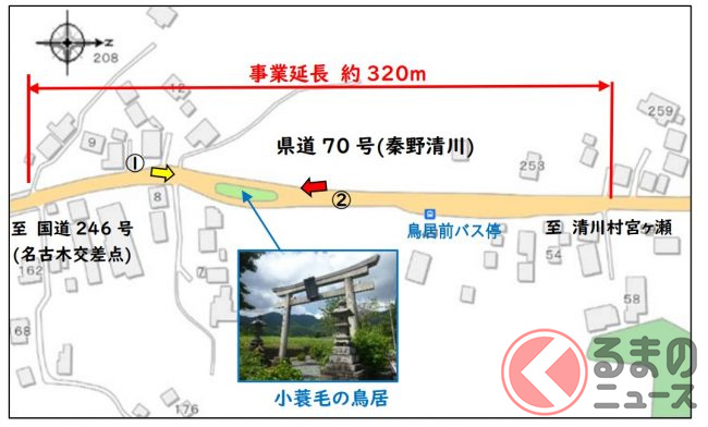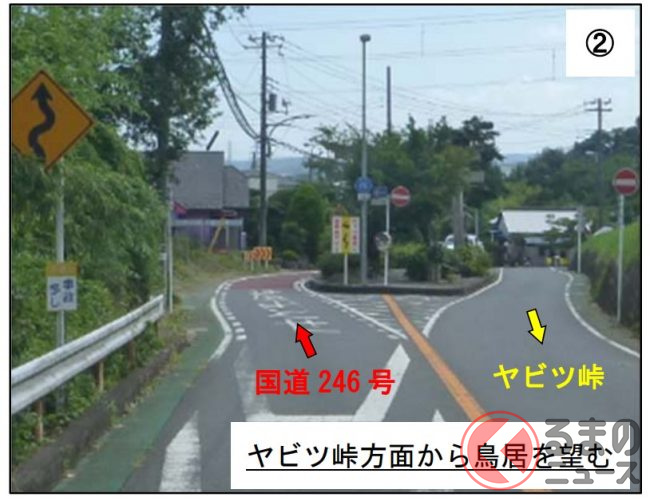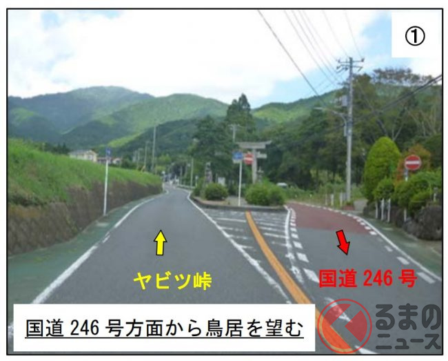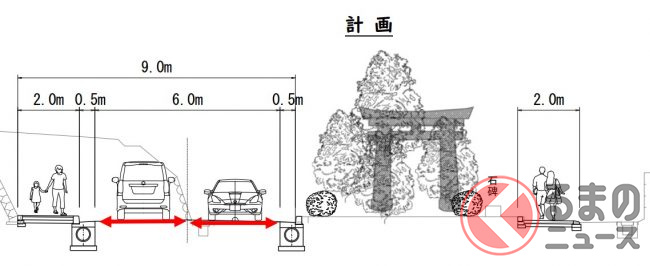 2024年1月29日に神奈川県が発表した資料によると、今回の道路改良工事で、車道が上下線とも鳥居の西側を通るようになり、「車道の真ん中に鳥居」という風景は無くなります。鳥居の東側は、歩道のスペースにあてられます。
