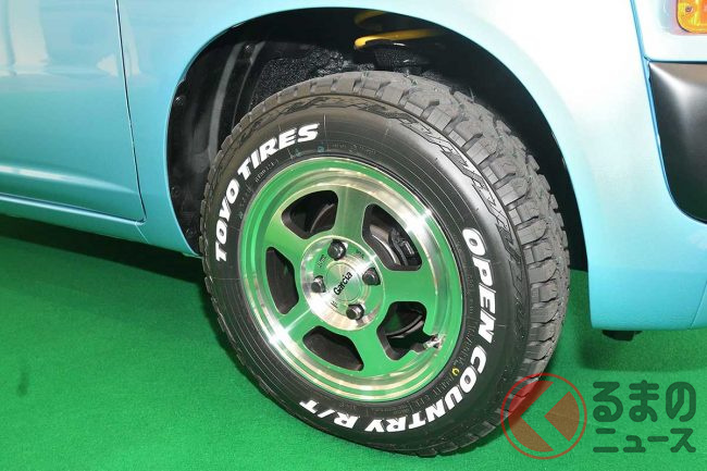ほかにも、1インチリフトアップされた足回りに、ホワイトレターのトーヨータイヤ「オープンカントリー R/T」と14インチホイールを組み合わせてオフロードスタイルを演出。