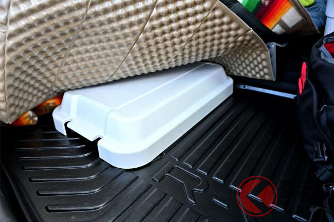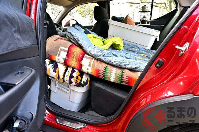 荷室とシートバックを前に倒した時に少し段差が発生してしまいますが、コンテナボックスの上蓋などを置いてその段差を埋めてあげることで、フラットな荷室になり快適な睡眠スペースが生まれます。
