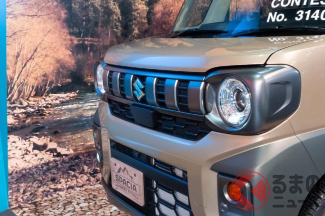 スズキ新型「軽SUV」実車公開! 次期型「スペーシアギア」な「ジムニー顔ハイトワゴン」! 斬新スタイルの「スペーシア」登場