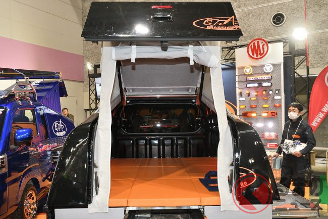 荷台部分には人が横になって休めるポップアップテントを設置。下部には左右と後方に引き出しを設置しています。後方部分は非常に長く、釣り竿などを持って行くのにもピッタリです。