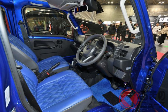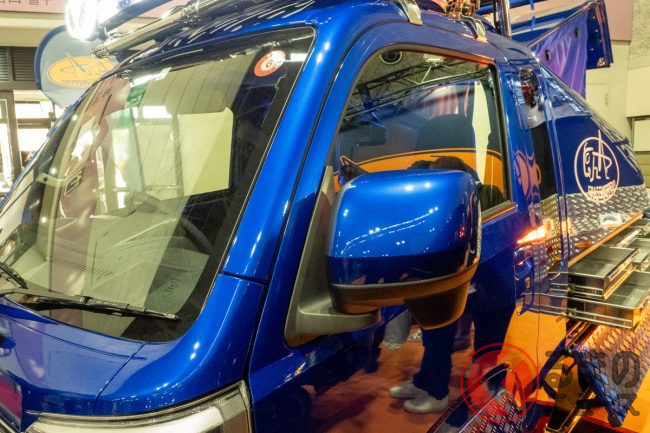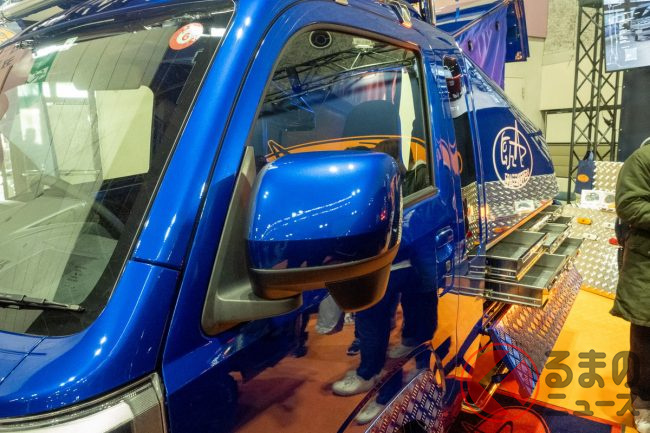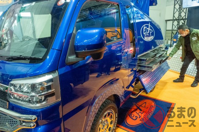 ブースの担当スタッフによれば、開発コンセプトは「職人さん仕様」とのこと。また、軽トラックをベースにしながらも「格好良さ」と「走行性能」にこだわりカスタムしたそうです。