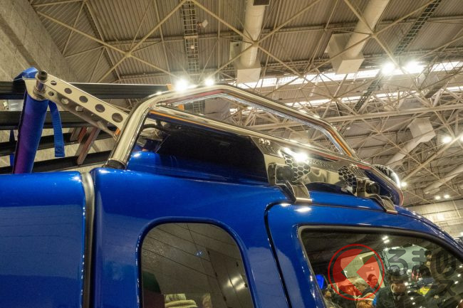 フロントには、バンパーガードや可変型ルーフラック、ドライビングランプなどを装備。いかにもオフロードを走行しそうな雰囲気に仕上がっています。