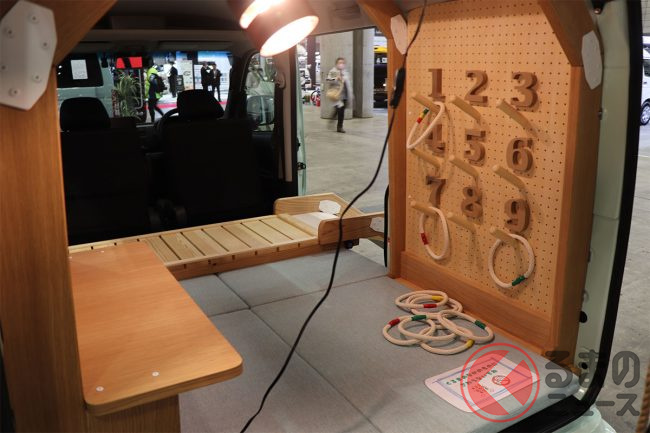さらに車内でも子どもが楽しめるよう、壁面は「わなげ」ができるようになっており、子どもならずとも思わず遊んでしまいたくなるような工夫が施されていました。