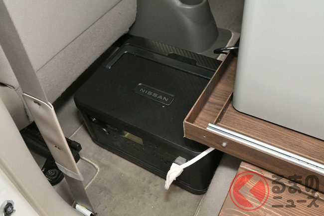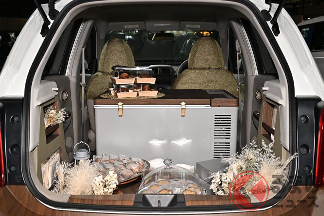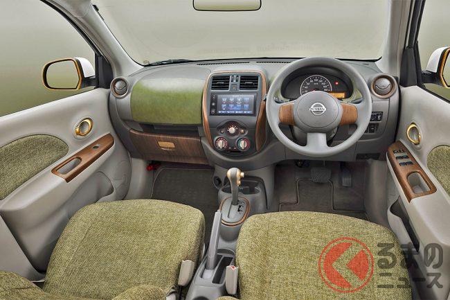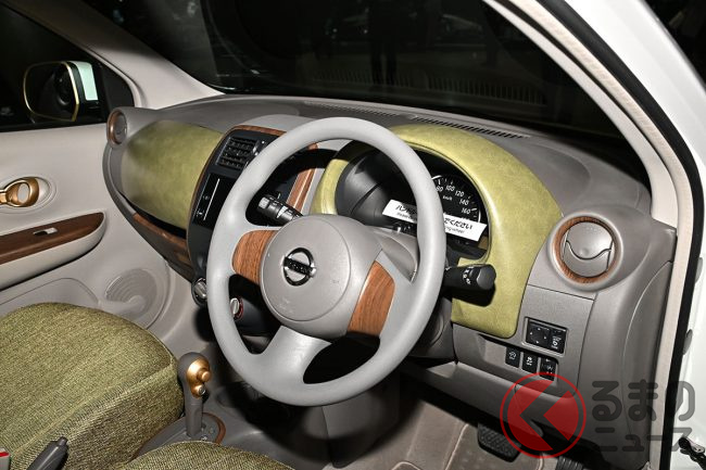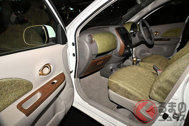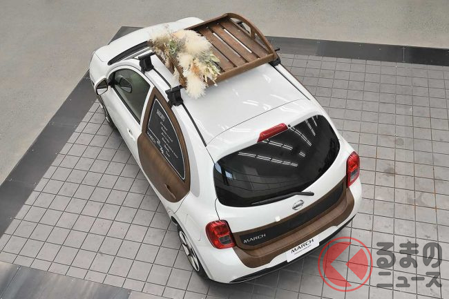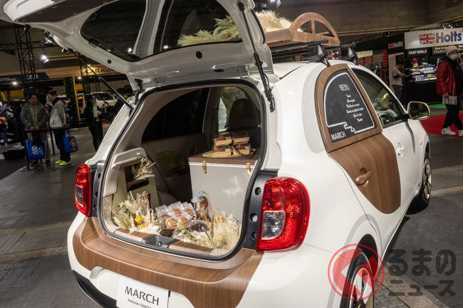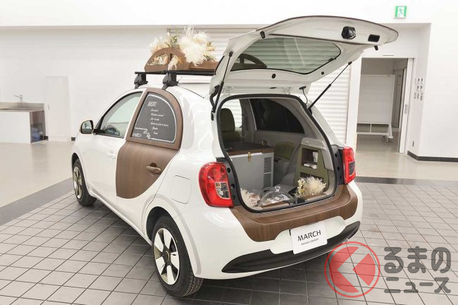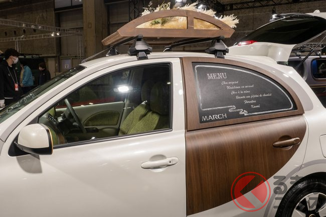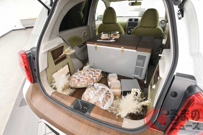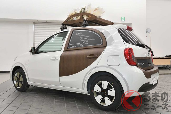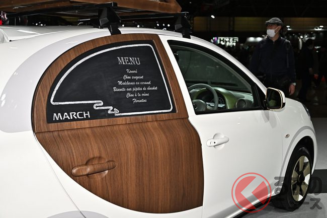 日産「マーチ」復活!? 斬新「“2人乗り”小型商用車」実車公開! オシャなウッド内装&「冷蔵庫」も完備「新コンパクトカー」の正体とは