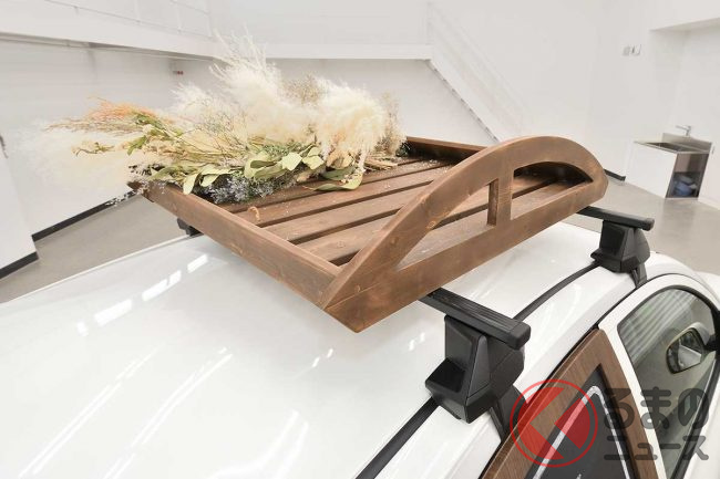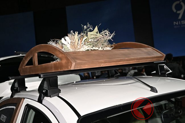 白を基調にしつつ、フロントグリルや後部ドアにウッド風のブラウンカラーを使用。また、タイヤホイールなどには黄緑色のカラーリングを施しています。