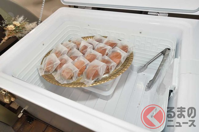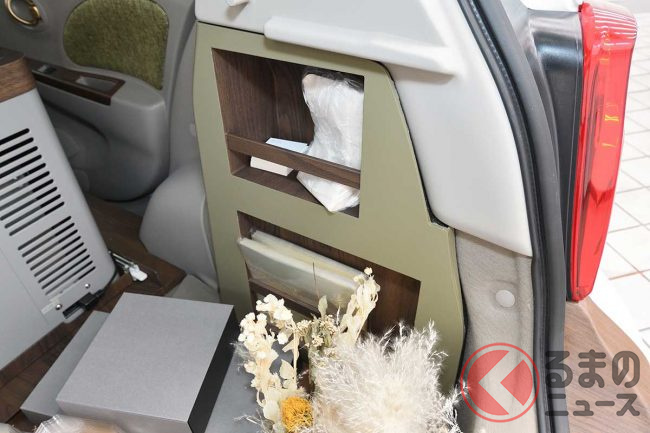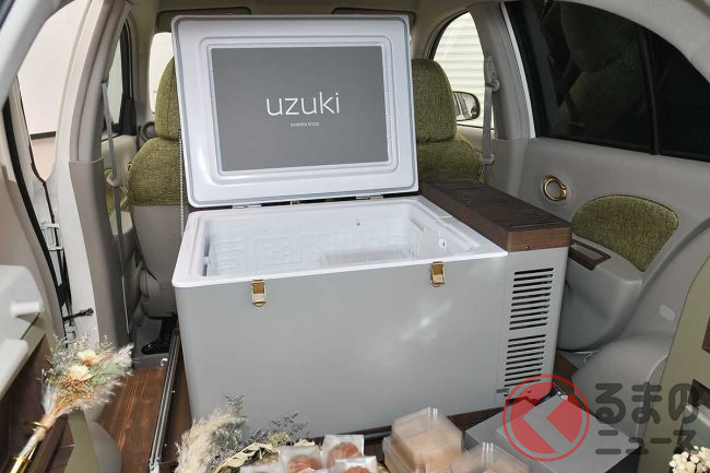 また、内装は落ち着いたグリーンのシートなどを配置。後部座席は取り払っていて、ケーキなどを収納できる大型の冷蔵庫を配置していました。