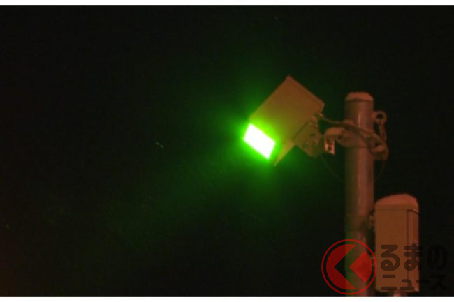 ライトを照射する機械が高速道路の一部に一定間隔に設置され、斜め上から緑色のライトが路面に照射。これにより、見えづらくなった外側線の位置をドライバーが容易に確認することができます。