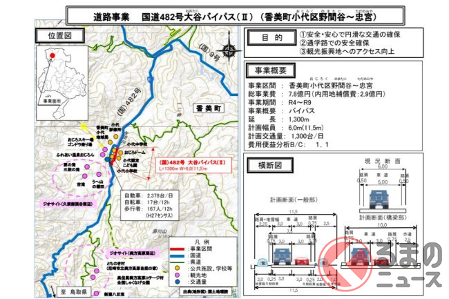 大谷バイパスは、道中にある旧美方町の中心部を、東側の矢田川対岸へ抜けるものです。現道はすれ違うのがたやっとの昔ながらの生活道路で、歩道も無く安全確保に課題がありました。