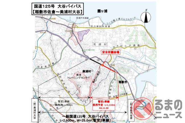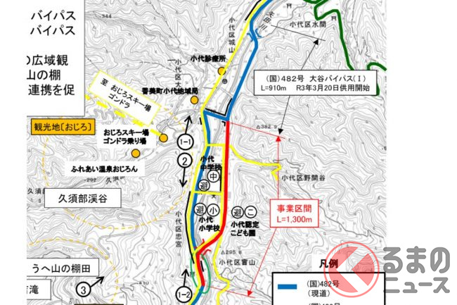 そこで南側の山裾に2車線を確保するのが、延長1.5kmの大谷バイパスです。2018年に全線開通しました。