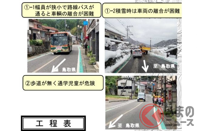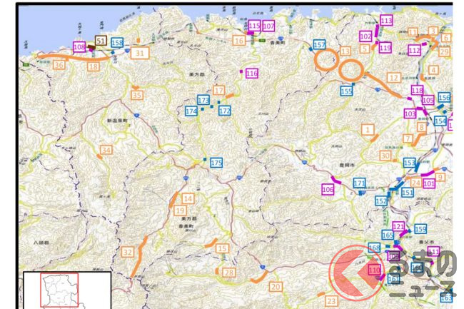 国道9号の「道の駅ハチ北」から山奥のハチ北温泉やスカイバレイスキー場へつなぐ県道茅野福岡線も、やはり生活道路の狭隘な道路で、観光シーズンをはじめ混雑や安全確保に課題がありました。
