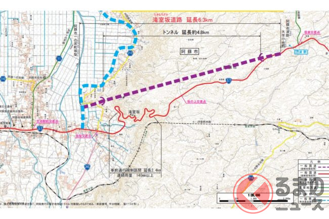 大津ICから先は「北側復旧道路」として2020年に開通済み。阿蘇市内では「阿蘇大津道路」という計画が事業化していましたが、2009年に休止し、国道57号現道の4車線化に落ち着いています。その先はトンネル主体の「滝室坂道路」が工事中です。