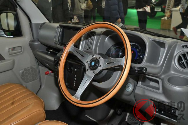 また運転席のハンドルをナルディ製のウッドステアリングに換装したほか、アルティナ製の革調シートカバーを装備し、外装のレトロなカスタマイズとのコーディネイトが図られていました。