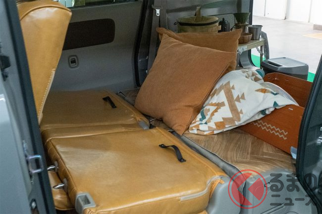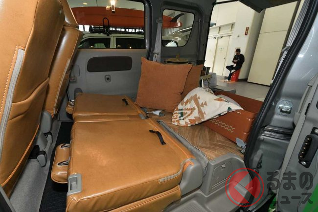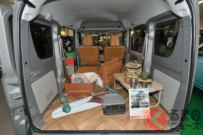 室内をのぞいてみると、荷室にはライトやミニテーブルなどが置かれ、床面はウッド調仕上げとなっており、キャンプや車中泊が楽しめる仕様となっています。