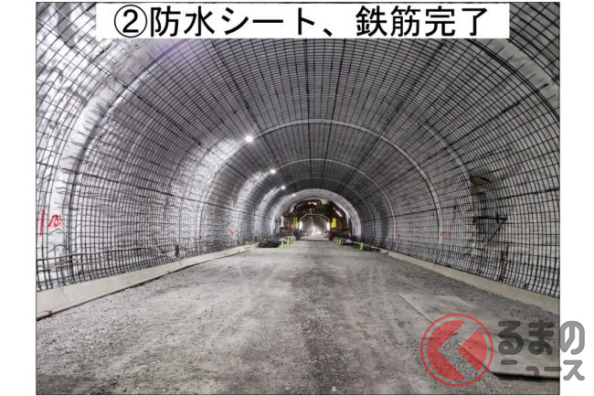 その覆工作業も、2024年2月末時点で、いよいよ「9割が完了」したと発表されました。覆工が終わればあとは電気設備や排水工、舗装といった「仕上げ作業」を残すのみとなります。