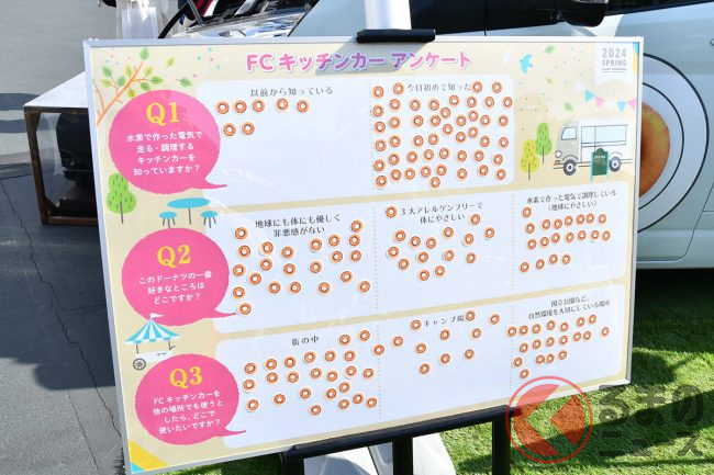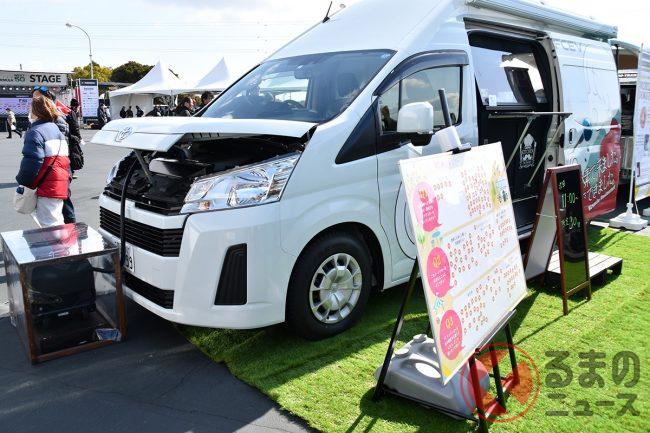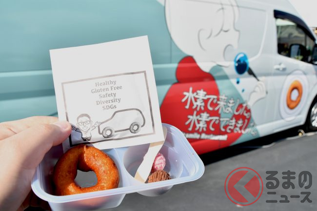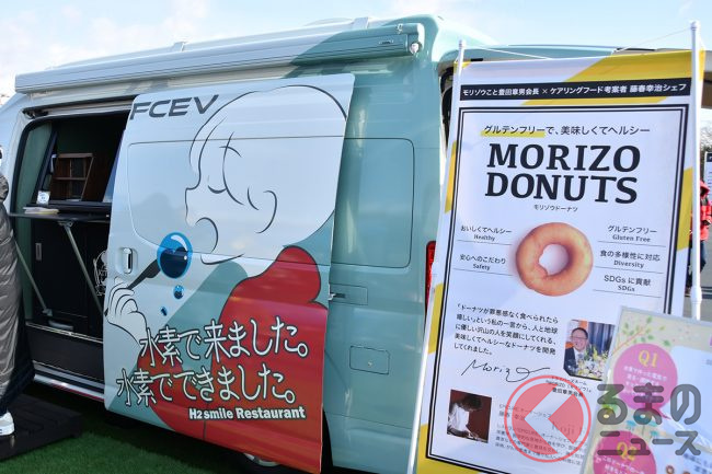 「モリゾウドーナツ」は東京・元麻布にあるレストラン「EPICURE」のオーナーシェフである藤春幸治氏が開発し、グルテンフリーでおいしさとヘルシーさを併せ持ったドーナツとのこと。このドーナツを作るキッチンカーも、海外仕様のハイエースをベースにFCEV化された車両から供給される電力を使う特別仕様です。